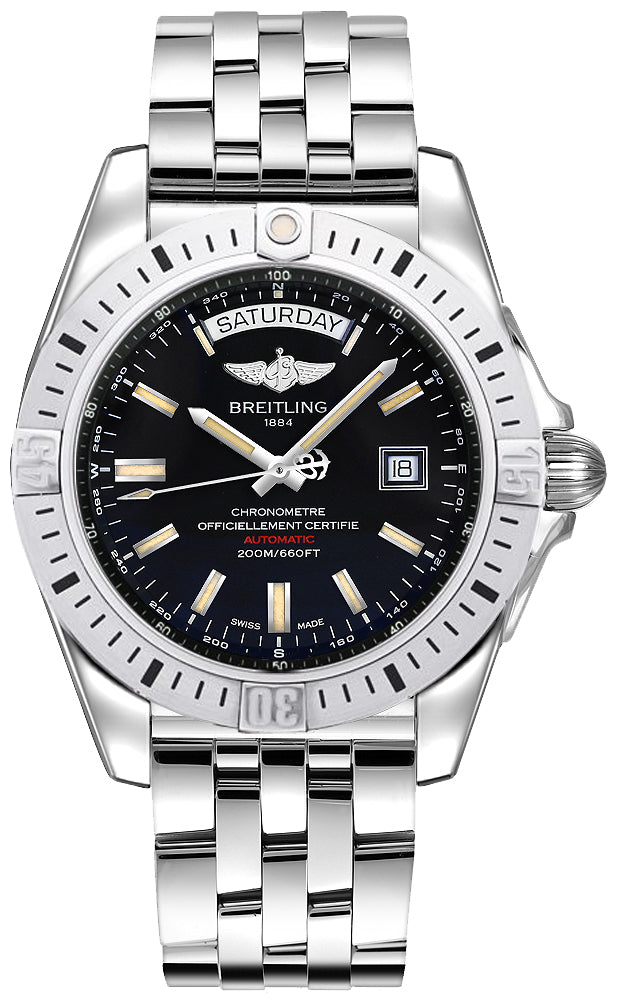 Exceptionally sporty and technical, the Galactic 44 collection offers masculinity on a grand scale. Clear apertures for the day and date features mark the decidedly strong dial designs that include luminescent hands and hour markers with scales lining the outer perimeter for compass as well as 1/100th of an hour divisions. Sturdy polished cases offer impressive 200 meters water resistance while projecting sleek, smooth looks. The Breitling Caliber 45 self-winding automatic chronometer certified movements guarantee superior reliability and unmatched accuracy. Now on sale, get a huge discount on the exquisite timepieces!