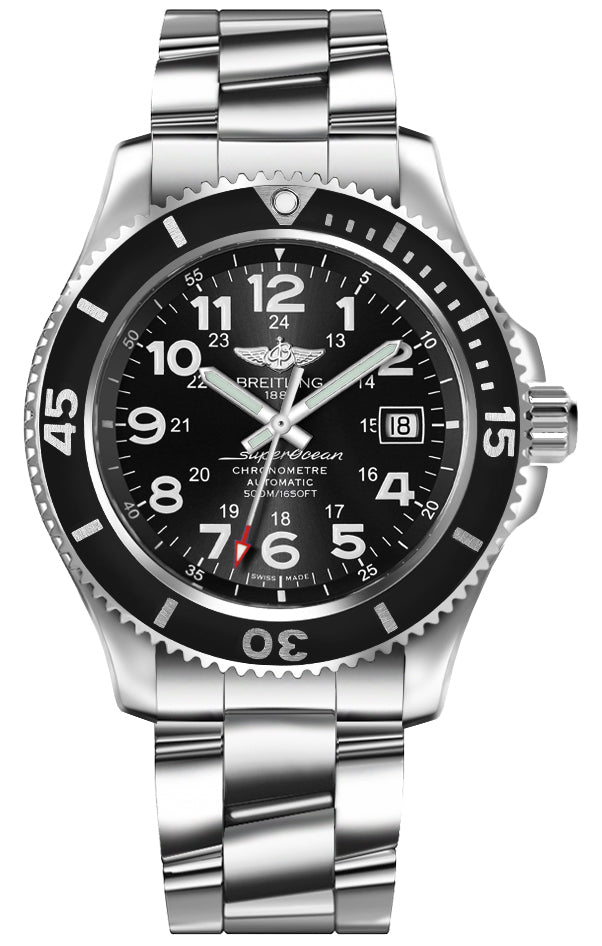 The Breitling Superocean II 42mm men's collection of diving watches is available for purchase on AbbeyFive.com with the best sale prices you can find online. This Breitling men's watch comes in two dial colors: volcano black or mariner blue, with a matching colored steel unidirectional rotating bezel. The polished stainless steel case houses the Breitling caliber 17 self-winding automatic COSC chronometer-certified movement and has a water-resistance of 500 meters (1,650 feet). Shop the Breitling Superocean II 42 men's watch on AbbeyFive.com and receive free fully insured shipping worldwide and world-class customer service.