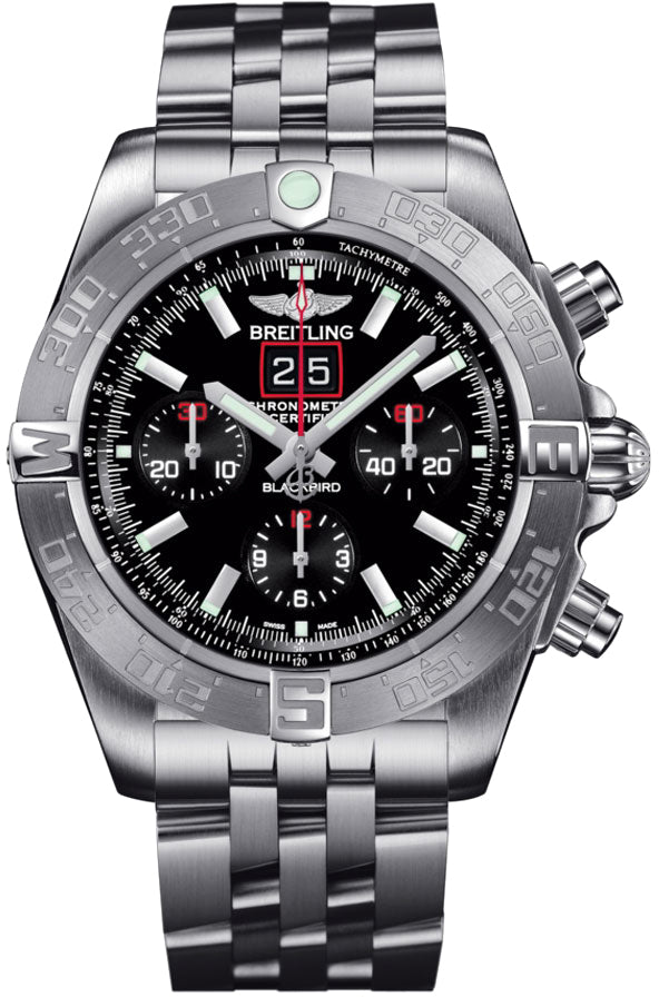 Breitling Blackbird watches are a special series designed on the shoulders of the Chronomat. A large aperture date window with split indicators and a COSC Certified Chronometer auto chrono movement make this a timepiece that boasts high functionality in a classy, sporty design.