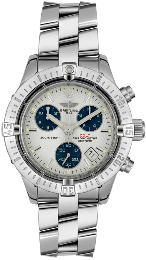 Breitling's Chrono Colt II exhibits a combination of power and style. This luxury wristwatch combines a sophisticated look with a plethora of features including a chronograph, date and Unidirectional rotating bezel for reliable timing of flights, dives and other activities. The strong case provides a fantastic 200 meters water resistance rating for the professional divers out there. The dial displays a wealth of information without feeling too cluttered thanks to the elegant design. The readability of the dial is further enhanced by large luminescent hands and hour markers making this an easy to use instrument for professionals who demand a tool that offers reliability and accessibility. Our low prices make this beautiful timepiece an incredible deal!
