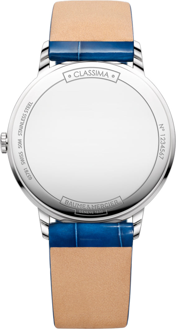 The Baume & Mercier Classima Women's Watch M0A10226 is crafted with a polished stainless steel case that encases a white mother-of-pearl dial. The center of the dial features a unique design, while silver-tone hands and diamonds & Roman numeral hour markers add a touch of elegance. At the 6 o'clock position, there is a date display aperture, and below the 12 o'clock position, a moonphase display. The watch is completed by a blue leather strap with a deployment buckle clasp for a secure and adjustable fit. This Swiss quartz watch boasts a water-resistance of up to 50 meters/165 feet.