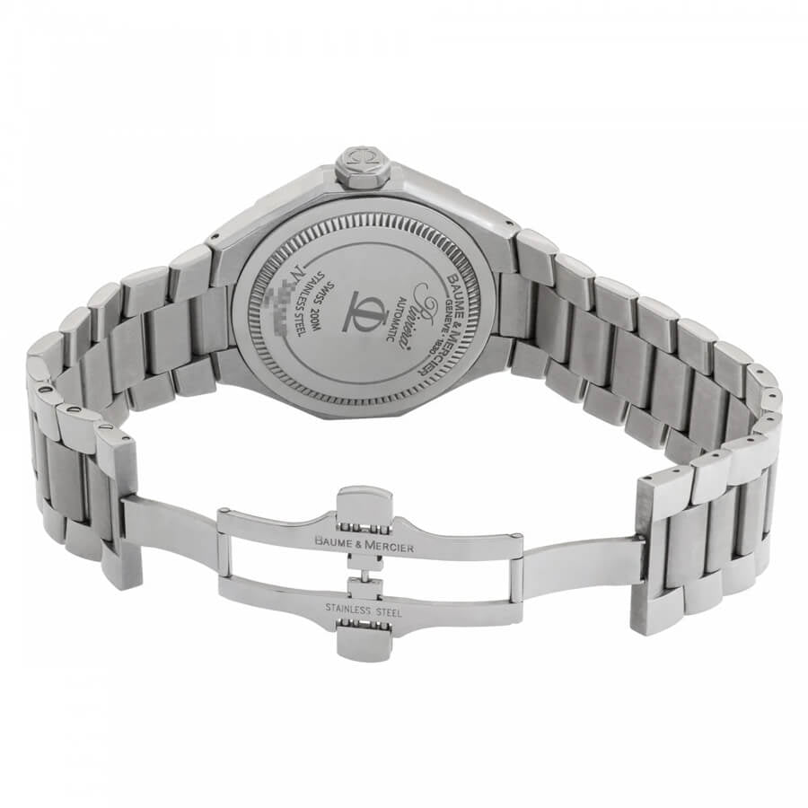 This 38mm watch from Baume & Mercier Riviera is designed for men. It boasts a stainless steel case and bracelet, along with a black dial featuring diamond hour markers and a date window at 6 o'clock. Powered by a self-winding automatic movement, this watch is a must-have for any watch enthusiast.