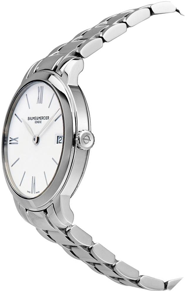 The Baume & Mercier Classima MOA10335 is a 31mm round stainless steel watch with a scratch-resistant sapphire crystal and matching bracelet featuring a deployment buckle. The white dial is adorned with rhodium-plated hands, classic Roman numerals, and a date aperture at 3 o'clock. Precision is ensured with the Swiss-made quartz movement of this stainless steel bracelet watch designed for women.