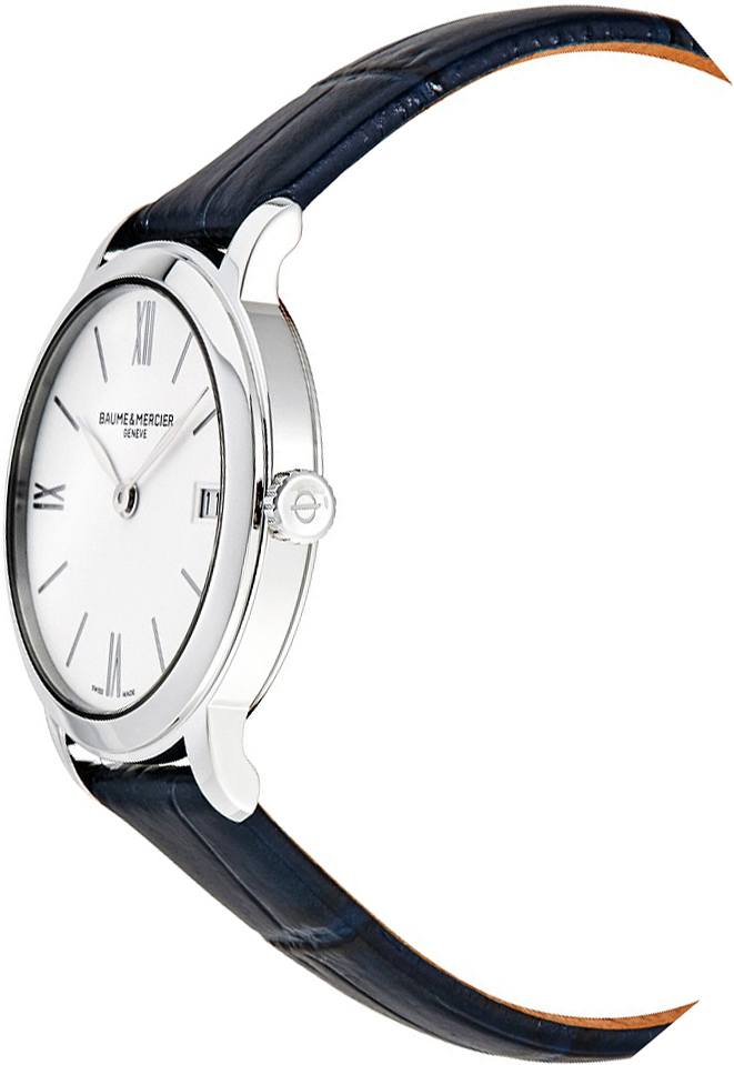 Experience sophistication with the Baume & Mercier Classima MOA10353 watch. Boasting a glossy blue leather strap and white dial with rhodium-plated hands, this 31 mm steel watch exudes elegance. The classic Roman numerals at 6, 9, and 12 o'clock and date aperture at 3 o'clock add a balanced touch. Powered by a battery operated quartz movement, this watch is the perfect combination of style and precision.
