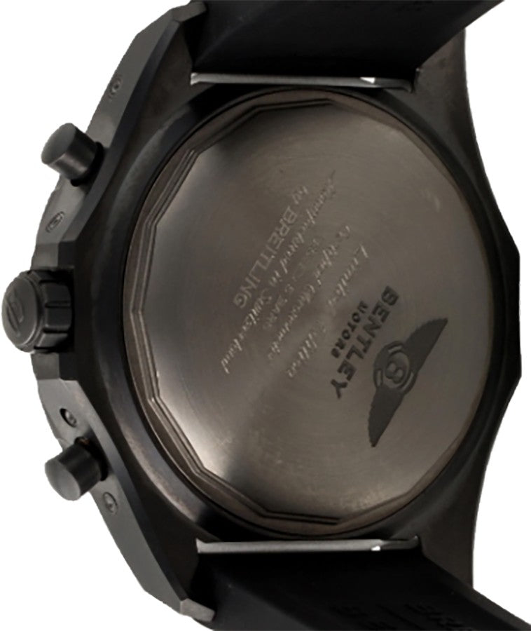 This limited edition Breitling Bentley timepiece, V2936422/BC47-155S, is a luxurious choice for those who value iconic and athletic luxury. It boasts a sleek black titanium case and a black rubber strap with a deployment buckle. The black dial showcases index hour markers, a perpetual calendar, a chronograph, a moon phase, and a tachymeter scale. Furthermore, this self-winding automatic chronometer uses a remarkable movement for accurate timekeeping. With delicate detailing and precise workmanship, this watch is a must-have in your collection.