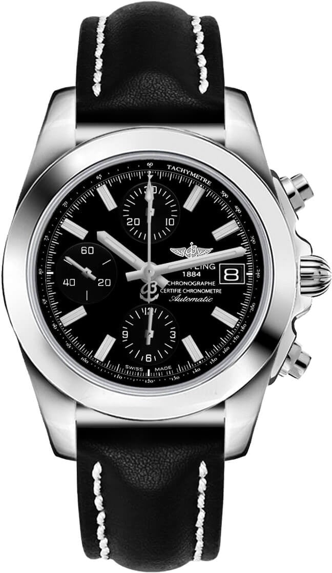 This Swiss made Breitling Chronomat 38 W1331012/BD92-428X men's watch is a prime example of luxury and expert craftsmanship. Sporting a polished stainless steel case and black leather strap, with a tungsten fixed bezel and luminescent hands, this timepiece is both functional and stylish. The black dial features index hour markers and a date window at 3 o'clock, while the chronograph boasts a large central seconds hand, a 30-minute counter at 12 o'clock, and a 12-hour counter at 6 o'clock. With a raised inner bezel flange containing a tachymeter scale, this watch is powered by the Breitling Caliber 13 self-winding automatic COSC Chronometer certified movement, providing a 42-hour power reserve and beating at 28,800 vph with 25 jewels.