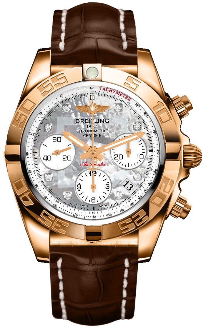 The Breitling Chronomat 41 Rose Gold Men's Watch HB014012/A723-722P boasts a 41mm polished solid 18k rose gold case and elegant brown leather strap with a unique pattern. Its unidirectional rotating bezel, featuring a 60 minute scale, is also crafted from polished solid 18k rose gold. The watch's white mother of pearl dial is adorned with luminescent hands, 8 sparkling diamond hour markers, and a convenient date display between 4 and 5 o'clock. Other features include a chronograph with a large central seconds hand, 30 minute counter at 3 o'clock, 12 hour counter at 6 o'clock, and small seconds sub-dial at 9 o'clock. The tachymeter scale adds a functional element to this luxurious timepiece. With its Breitling Caliber 01 self-winding automatic COSC Chronometer certified movement,