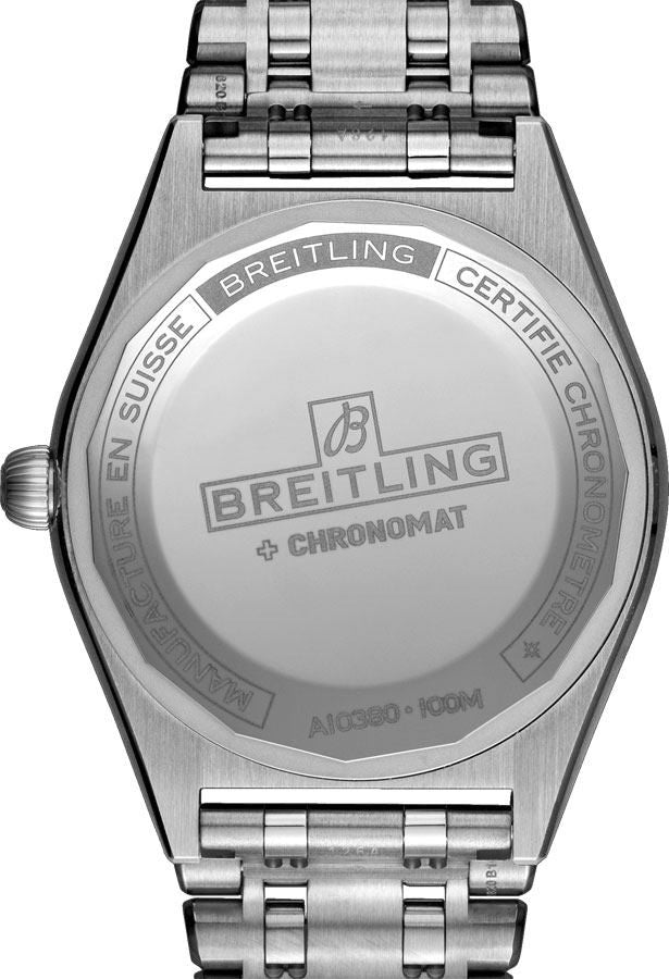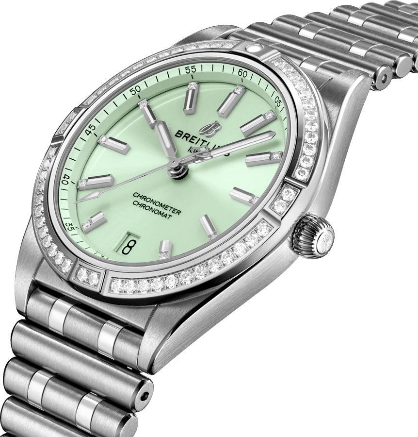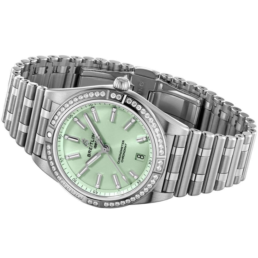 Expertly crafted, the Breitling Chronomat Automatic 36 Luxury Watch A10380591L1A1 combines a 36mm stainless steel case with a diamond-set bezel and rouleaux bracelet. Displayed on the mint green dial are index and diamond hour markers along with a date window at 6 o'clock. This watch is powered by the Breitling Caliber 10 self-winding automatic COSC Chronometer certified movement, providing a 42 hour power reserve.