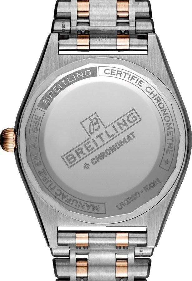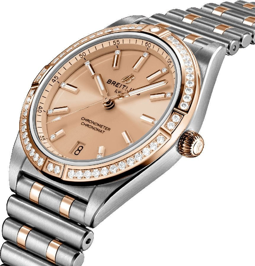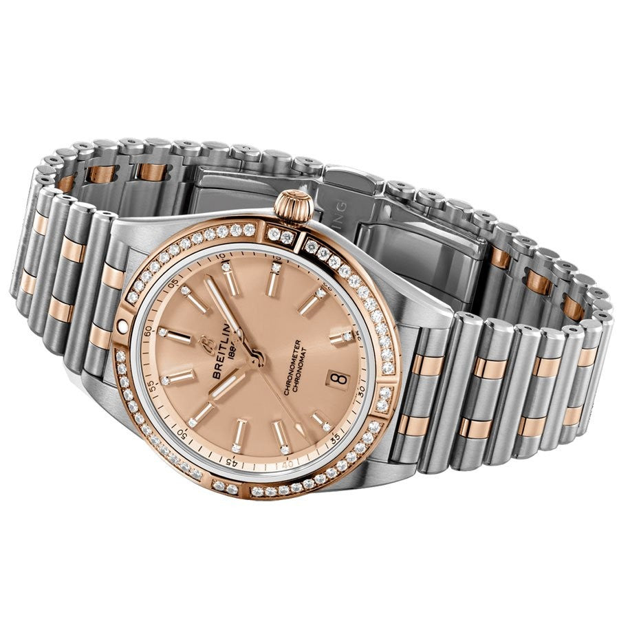 The Breitling Chronomat Automatic 36 Diamond Bezel Women's Watch U10380591K1U1 offers a sophisticated design with a 36mm stainless steel case, 18k rose gold diamond-set bezel, and two-tone Rouleaux bracelet. The copper dial boasts diamond and index hour markers, along with a convenient 6 O'Clock date window. This watch is expertly powered by the Breitling Caliber 10 self-winding automatic COSC Chronometer certified movement, providing a 42-hour power reserve for reliable performance.