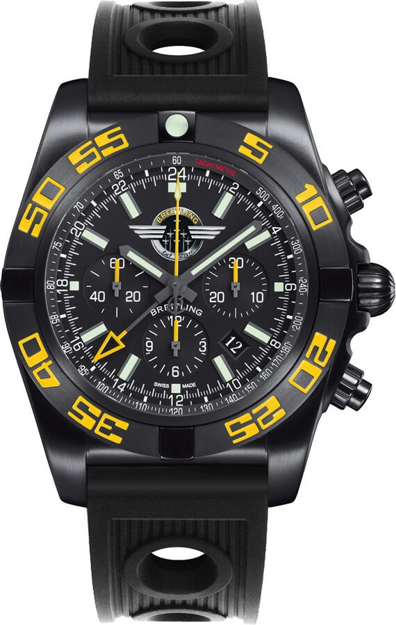 The Breitling Chronomat GMT Onyx Black Men's Watch MB04108P/BD76-201S is a limited edition piece, with only 250 ever made. Its features include a black stainless steel case, a black Ocean Racer rubber strap, and a black stainless steel bidirectional rotating bezel. The onyx black dial has luminescent hands and index hour markers and a date display at 4 o'clock. This watch also has a chronograph function with a large central chronograph seconds hand, a 30 minute counter sub-dial at 3 o'clock, and a 12 hour counter sub-dial at 6 o'clock. Additionally, there is a small seconds sub-dial at 9 o'clock and GMT 2nd and 3rd time zone features. The tachymeter scale adds a useful feature for calculating speed. The watch is powered by the Breitling Caliber B04 self-winding automatic COSC Chronometer certified movement.
