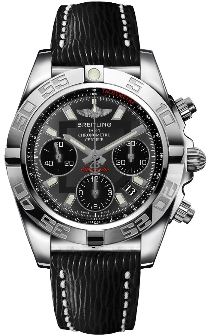 The Breitling Chronomat 41 Automatic Chronograph features a stainless steel case, black leather strap, unidirectional rotating bezel, and grey dial with luminescent hands and markers. It is designed with a tachymeter, date display at 4 and 5 o'clock positions, and three black sub-dials displaying 60 second, 30 minute, and 12 hour increments. The watch also includes an automatic movement and scratch-resistant sapphire crystal. With a round case shape, 41mm case diameter, and 15.4mm case thickness, this luxury watch is water-resistant up to 300 meters and includes functions such as chronograph, date, and Chronometer. It is proudly labeled as Swiss Made.