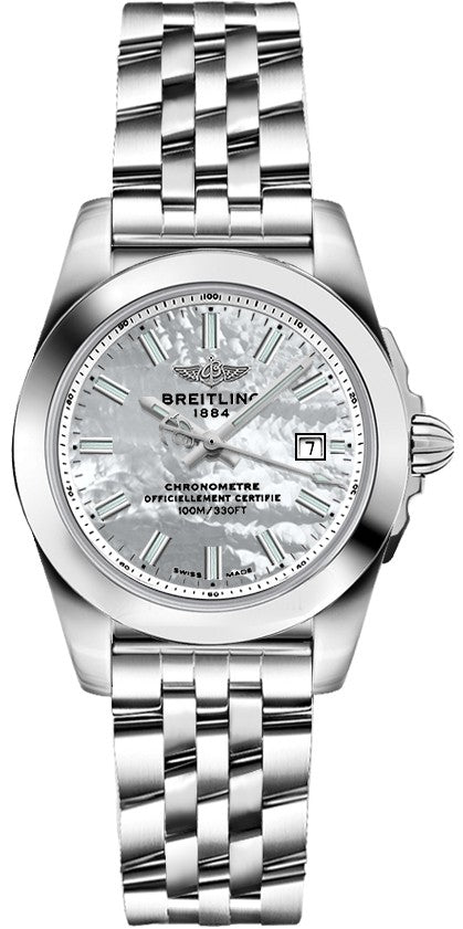 Breitling Galactic 29 Sleekt W7234812/A784-791A women's watch. Features a polished stainless steel case and Pilot bracelet. Polished fixed tungsten carbide bezel. White Mother of Pearl dial with luminescent hour hand, minute hand and index hour markers. White flange with 1/100th minute scale. Date displayed in dial aperture at 3 o'clock. End of life indicator (EOL). Powered by the Breitling caliber 72 battery operated SuperQuartz COSC Chronometer certified movement. A cambered, scratch resistant sapphire crystal glareproofed on both sides protects the dial. The case is round, 29mm in diameter, weighs 30.03g and is 8.90mm thick. Inlet size: 14mm. Non screw-locked crown with 2 gaskets. Stainless steel deployment buckle. Water resistant to 100 meters / 330 feet. Functions: hours, minutes, seconds, date. Casual watch style. Swiss made.