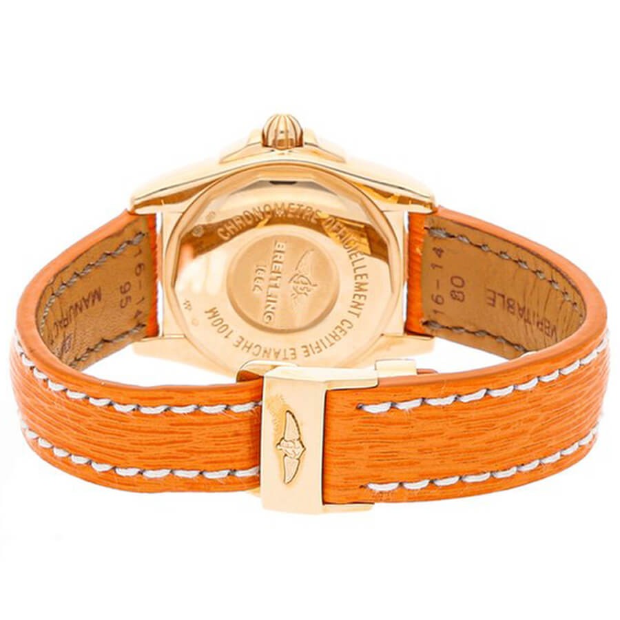 The Breitling Galactic 32 Sleek Diamonds Women's Watch H7133012/H550-255X features a solid 18k rose gold case, a diamond-studded golden sun dial, and a scratch-resistant sapphire crystal. This limited production watch is powered by a Breitling Caliber 71 battery-powered SuperQuartz COSC Chronometer certified movement, with a date display at 3 o'clock and an end of life indicator. The elegant timepiece is water resistant up to 100 meters and includes functions for hours, minutes, seconds, and date. Made in Switzerland with a professional and scientific approach, this watch is a luxurious addition to any collection.