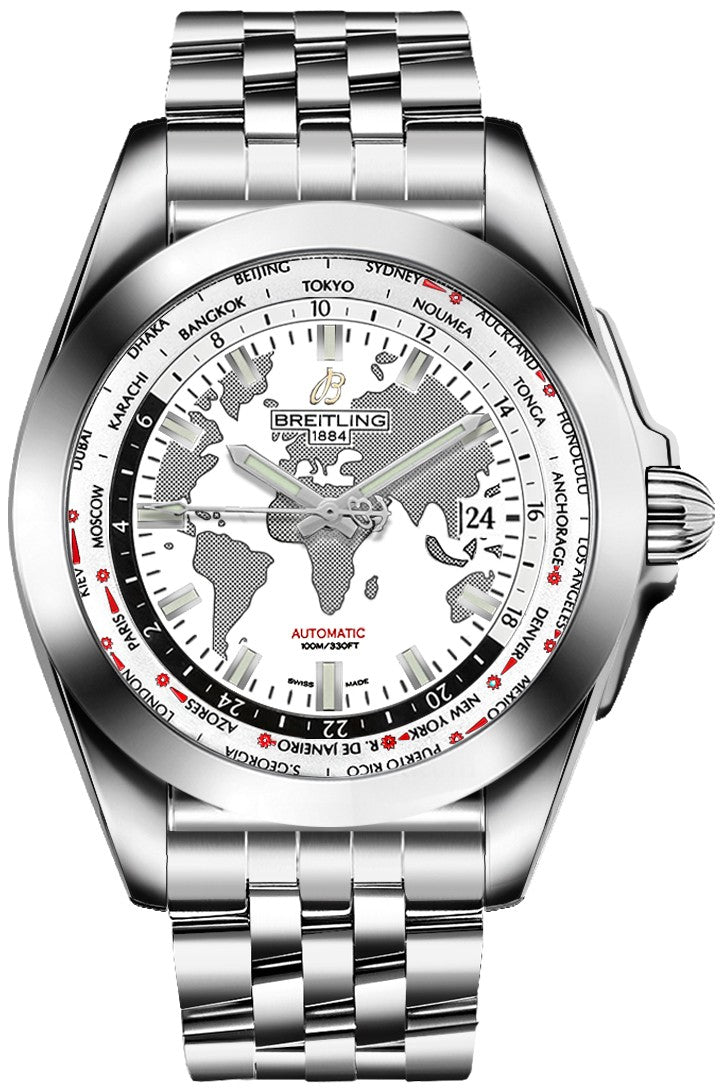 The Breitling Galactic Unitime WB3510U0/A777-375A men's watch features a polished stainless steel case and Pilot bracelet, along with a polished tungsten carbide fixed bezel. The Antarctica world map white dial displays luminescent hands and index hour markers, with a date window located at 3 o'clock. The watch also includes a world time zone feature with a world city ring on the dial edge, as well as a day and night indicator. It is powered by the Breitling Caliber B35 self-winding automatic COSC Chronometer certified movement, which has a 70 hour power reserve and contains 41 jewels. The dial is protected by a scratch-resistant glareproof sapphire crystal, and the watch has a round case measuring 44mm in diameter and 15.3mm in thickness. The inlet size is 22mm and the watch has a solid case back, as well as a screw down crown and case back.