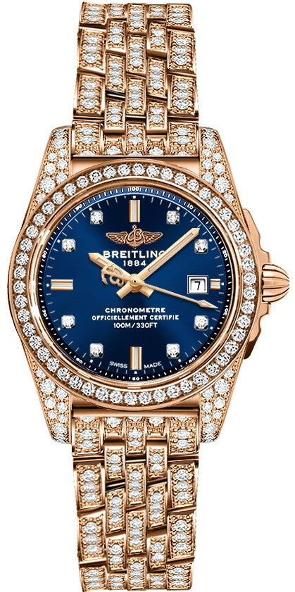 Breitling Galactic 29 Women's Luxury Watch H7234863/A792-791T. This 29mm luxury watch features a diamond-set 18k rose gold case and diamond-set rose gold bracelet. The blue dial has diamond and index hour markers with a date window displayed at 3 o'clock. It is powered by the Breitling Caliber 72 battery operated SuperQuartz COSC Chronometer certified movement.