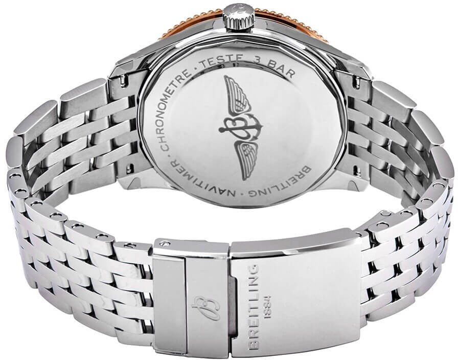 The Breitling Navitimer Automatic 41 U17326211G1A1 men's watch boasts a polished stainless steel case and bracelet, along with a polished solid 18k rose gold bidirectional rotating bezel for a luxurious touch. Its silver dial features luminescent hands and rose gold index hour markers, with a date displayed in a dial aperture at 6 o'clock. The watch also includes a circular aviation slide rule that aids in tracking various functions. Powered by the Breitling Caliber 17 self-winding automatic COSC Chronometer certified movement with a 38 hour power reserve and 25 jewels, this watch is both reliable and precise. Protecting the dial is a cambered scratch resistant sapphire crystal that is glareproofed on both sides. The round case measures 41mm in diameter and is 10mm thick, with a non screw-locked crown with 2 gaskets and a screw down case back.
