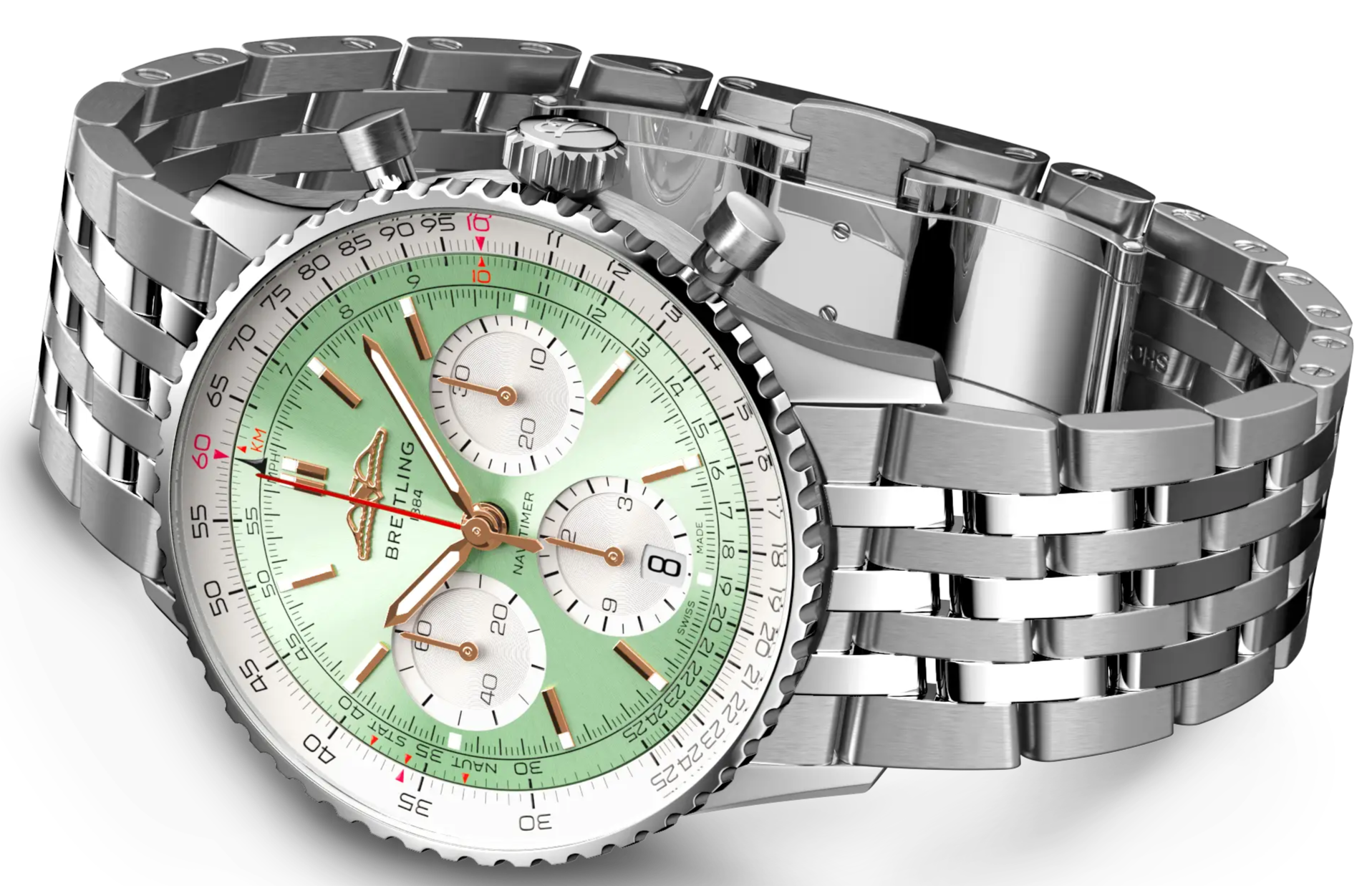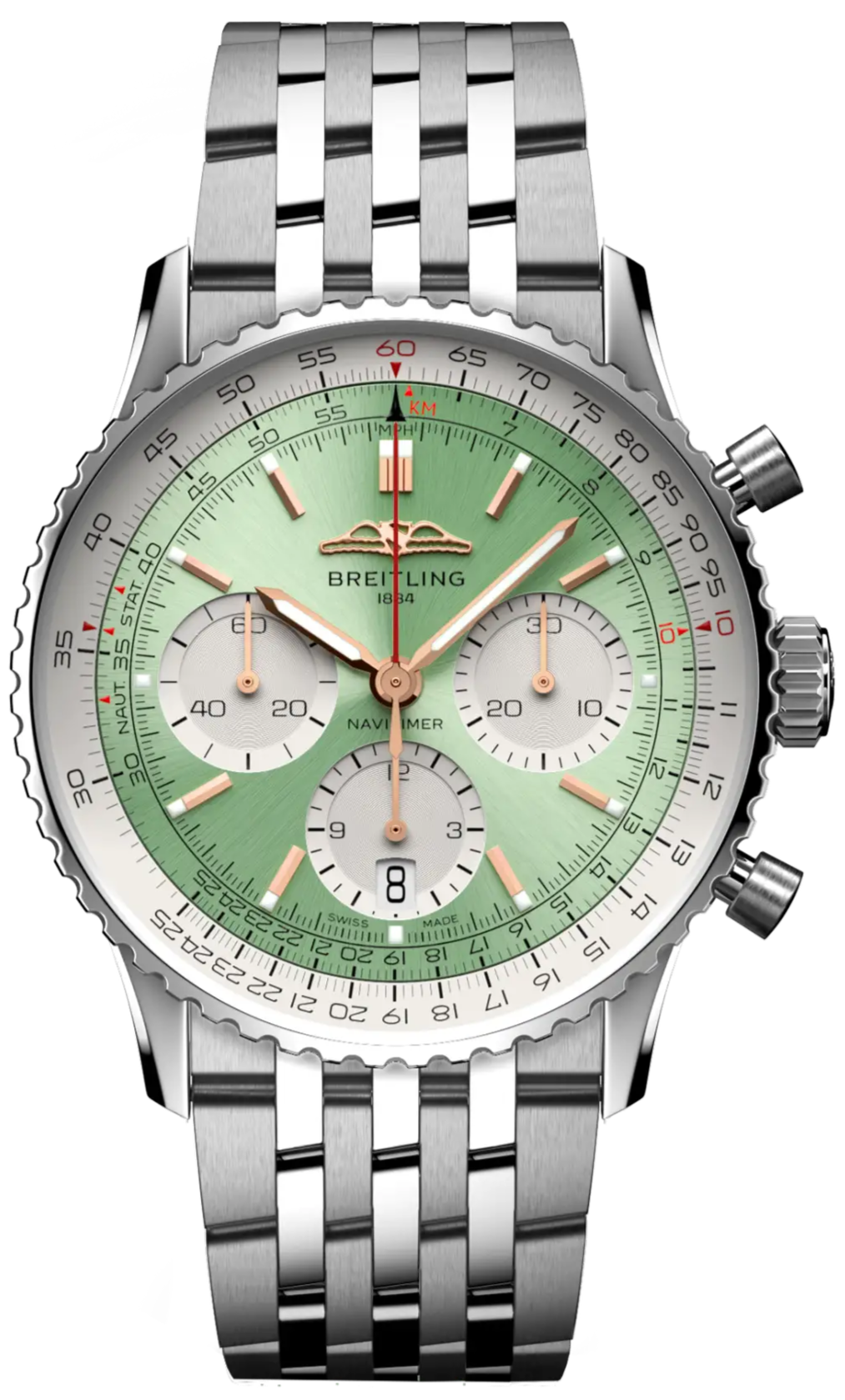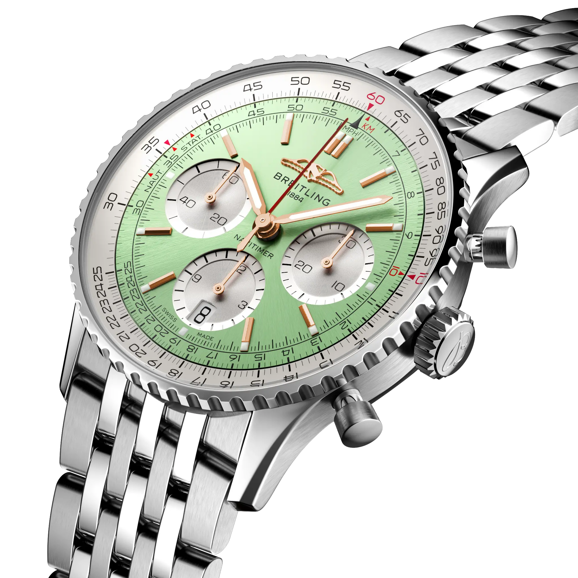 Experience the timeless elegance of the Breitling Navitimer B01 Chronograph 41, featuring a modern twist with a sleek green dial. Crafted with a stainless steel case and bracelet, this timepiece boasts a 41mm diameter and an automatic chronograph with date and slide rule, all certified by a chronometer.