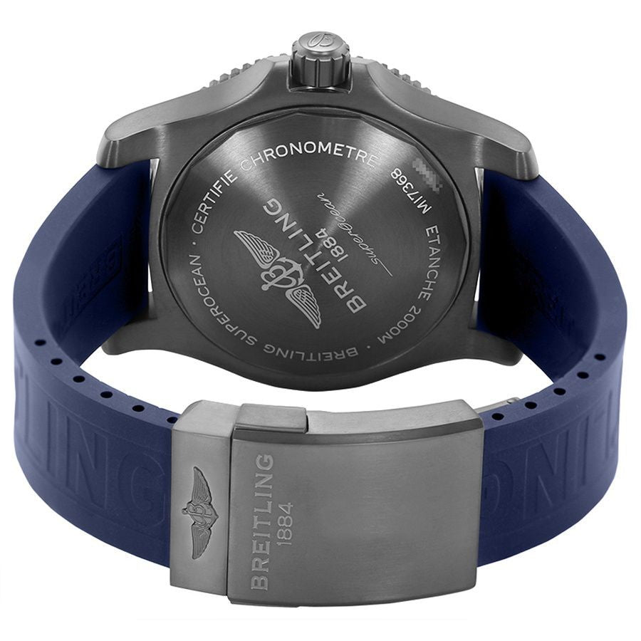 The Breitling Superocean Automatic Black Steel Men's Watch M17368D71C1S2 is a 46mm diving watch equipped with a durable black DLC-coated stainless steel case and a navy blue Diver Pro III rubber strap. Its blue dial showcases luminescent hands, Arabic numerals, and index hour markers, all powered by the reliable Breitling Caliber 17 self-winding automatic COSC Chronometer certified movement with a 38-hour power reserve.