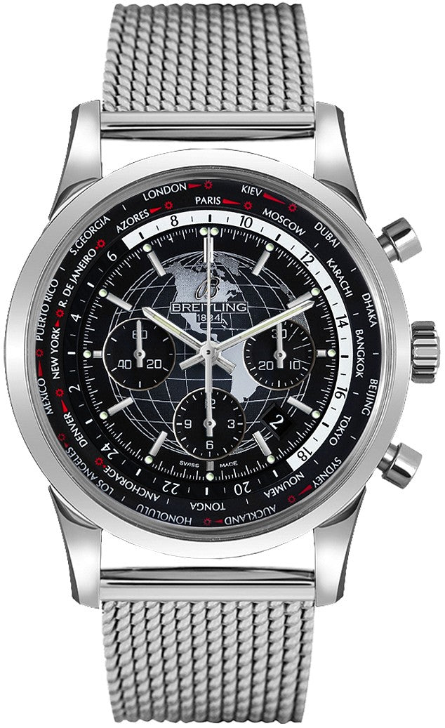 The Breitling Transocean Chronograph Unitime AB0510U4/BE84-152A men's watch boasts a polished stainless steel case and Ocean Classic bracelet, with a fixed, polished stainless steel bezel. Its black dial features a unique globe design, luminescent hands, and index hour markers for optimal visibility. Other features include a date window at 4-5 o'clock, a central chronograph seconds hand, a 30-minute counter at 3 o'clock, and a 12-hour counter at 6 o'clock. The watch also includes a small seconds sub-dial at 9 o'clock, as well as a GMT world time zone function with a rotating disc of 24 world city time zones and an am/pm indicator. Equipped with the Breitling Caliber 05 self-winding automatic COSC Chronometer certified movement, this watch offers a 70-hour power reserve.