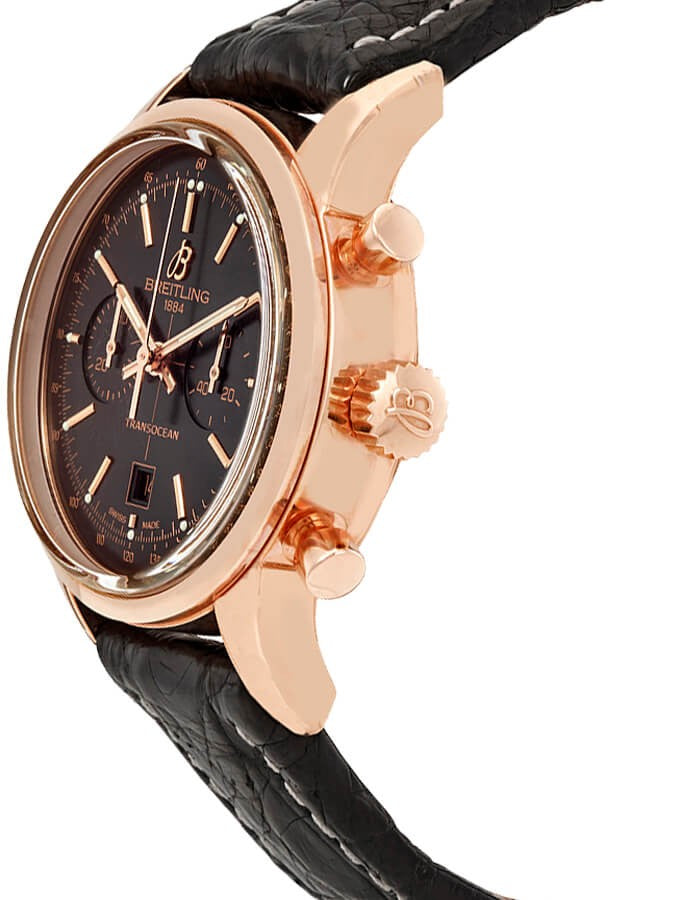 The Breitling Transocean Chronograph Black Dial Watch R4131012/BC07-728P is a limited production timepiece, perfect for both men and women. Crafted with a polished 18k rose gold case and featuring a striking black Leather Strap with Pattern, this watch exudes luxury and style. The black dial is adorned with luminescent hands and index hour markers, with a 30-minute counter sub-dial at 9 o'clock and a small seconds sub-dial at 3 o'clock. The date window is conveniently located at 6 o'clock and the watch also includes a tachymeter scale. Powered by the automatic Breitling Caliber 41 movement, this COSC Chronometer certified watch boasts a 42-hour power reserve, 28,800 vph, and 38 jewels.