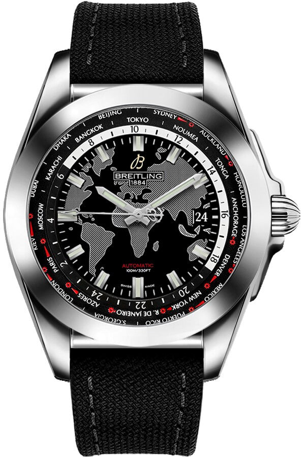 This Breitling Galactic Unitime WB3510U4/BD94-103W men's watch features a polished stainless steel case and black canvas strap. The tungsten carbide fixed bezel adds to the polished appearance. The trophy black dial has luminescent hands and index hour markers, with a date display window at 3 o'clock. The watch also includes a world time zone feature with a ring of world cities along the outer edge of the dial, as well as a day and night indicator. Powering the watch is the Breitling Caliber B35 self-winding automatic COSC Chronometer certified movement, boasting a 70 hour power reserve, 28,800 vph, and 41 jewels. The scratch-resistant sapphire crystal protects the dial, and the round case measures 44mm in diameter and 15.3mm in thickness. The inlet size is 22mm and the solid case back is secured with a screw down crown and case.