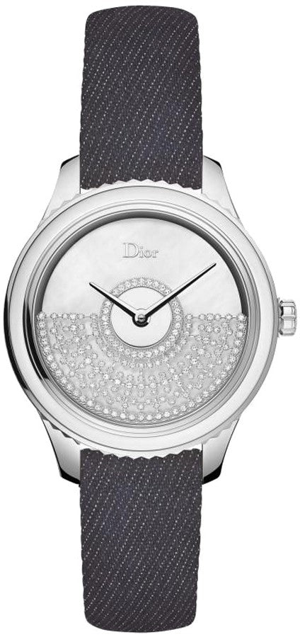 Experience the sophistication of the Christian Dior Grand Bal Diamonds Women's Watch CD153B16A001. This stunning 36mm timepiece boasts a stainless steel case and bezel, complemented by a Mother of Pearl bezel ring and a sleek grey denim strap with leather lining. The white Mother of Pearl dial showcases diamonds and a white gold oscillating weight, while the self-winding automatic movement ensures a 42-hour power reserve. Trust in the precision and elegance of this expertly crafted watch.