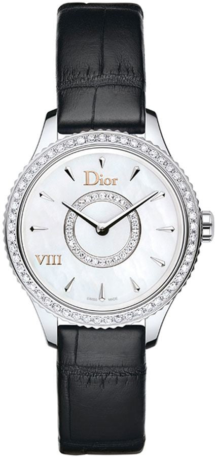 Christian Dior VIII Montaigne CD151110A001 women's watch. Features a stainless steel case and black Leather Strap with Pattern. The fixed bezel is set with diamonds. The white mother of pearl dial features a center ring set with diamonds, index hour markers and a Roman numeral hour marker for 8 o'clock. Powered by a battery operated quartz movement. A scratch resistant anti-reflective sapphire crystal protects the dial. The case is round and 25 mm in diameter. Push and pull crown. Stainless Steel tang buckle. Water resistant to 50 meters / 165 feet. Fashion watch style. Swiss made.