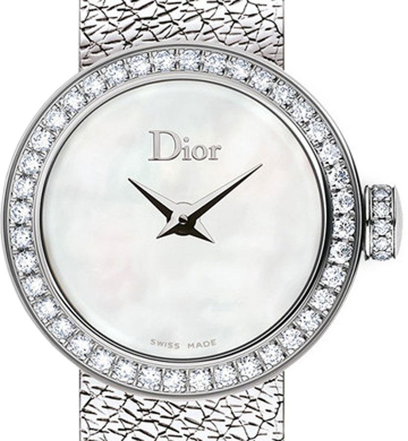 Christian Dior La Mini D De Dior Satine CD040110M001. Features a stainless steel case with a stainless steel Milanese bracelet. The bezel and crown are set with diamonds. The white mother of pearl dial features polished Dauphine hour and minute hands. Powered by a battery operated quartz movement. An anti-reflective sapphire crystal protects the dial. The case is round and 19 mm in diameter. Push and pull crown. Stainless steel folding clasp set with diamonds. Water resistant to 30 meters / 100 feet. Functions: hours and minutes. Fashion watch style. Swiss made.