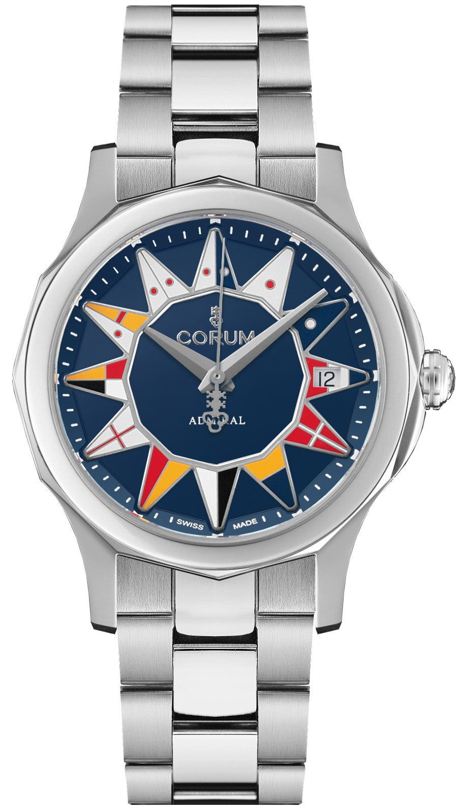 Corum Admiral Legend 38 082.200.20/V200 AB12 women's watch. Features a polished stainless steel case and brushed with polished stainless steel bracelet. Polished stainless steel fixed bezel. Blue dial with dauphine hands and nautical flag hour markers. Date displayed in window at 3 o'clock. Powered by the Corum Caliber CO 082 self-winding automatic movement which boasts a 42 hour power reserve, beats at 28,800 vph and contains 21 jewels. A double anti-reflective scratch resistant sapphire crystal protects the dial. The case is round, 38mm in diameter and 9.30mm thick. Inlet size: 18mm. Sapphire crystal exhibition case back. Push and pull crown. Stainless steel triple-blade folding deployment buckle. Water resistant to 50 meters / 165 feet. Functions: hours, minutes, seconds, date. Casual watch style. Swiss made.