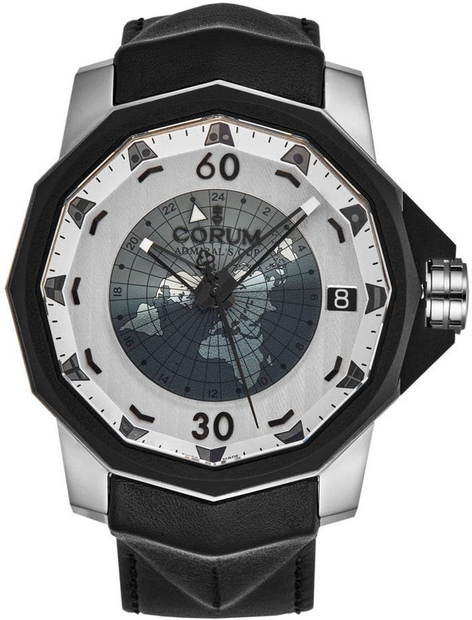Corum Admiral's Cup Men's Watch A171/04203. This 48mm watch features a titanium case with a black rubber bezel and a black leather strap. The grey dial with a globe motif has Arabic numeral and index hour markers, a date window displayed at 3 o'clock, and nautical flag markers on the edge of the dial. It is powered by the Corum Caliber CO 171 self-winding automatic movement with a 46-hour power reserve.