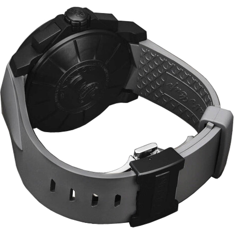 Corum Admiral's Cup Chronograph Men's Watch A753/04231. This 44mm watch features a black stainless steel case and bezel with a grey rubber strap. The grey dial has Arabic numeral and index minute markers, nautical flag markers on the edge of the dial, a date window displayed at 6 o'clock, and a chronograph. It is powered by the Corum Caliber CO 753 self-winding automatic movement with a 48-hour power reserve.