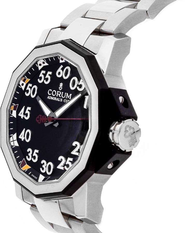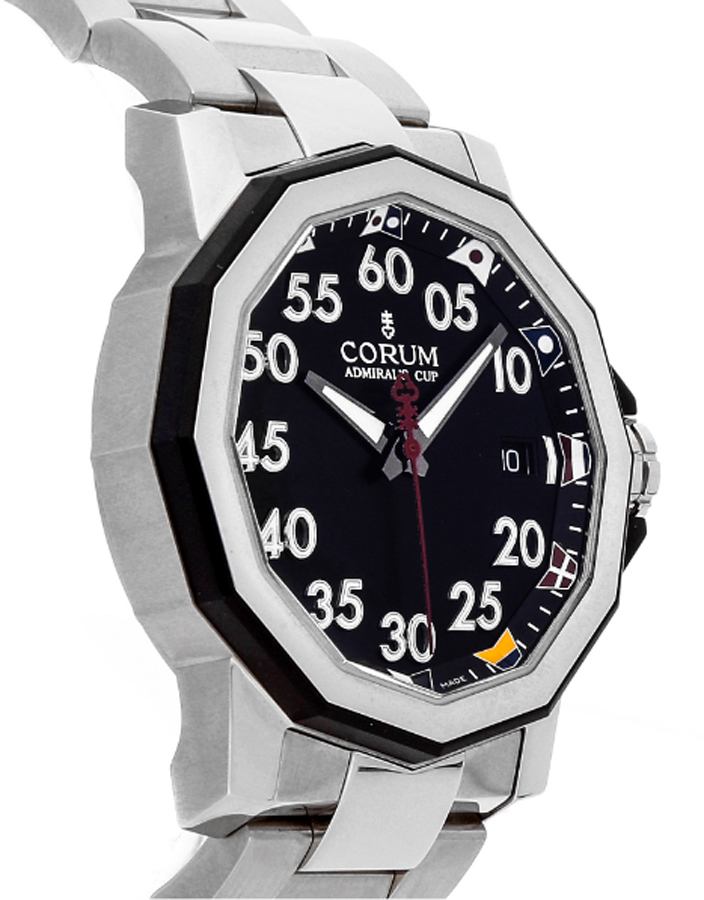 Corum Admirals Cup Men's Watch A082/03375. This 40mm watch features a stainless steel case and bracelet. The black dial has luminescent hands and Arabic numeral minute markers with nautical flag markers on edge of dial and a date window displayed at 3 o'clock. It is powered by the Corum Caliber CO 082 self-winding automatic movement with a 42 hour power reserve.