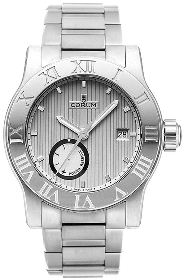 Corum Romvlvs 373.515.20/V810.BA65 men's watch. Features a brushed with polished stainless steel case and bracelet. Polished stainless steel fixed bezel engraved with Roman numeral hour markers. Guilloche silver dial with luminescent hands. Index hour markers. Date displayed in window at 3 o'clock. Power reserve indicator between 6 and 7 o'clock. Powered by the Corum Caliber FL 301 self-winding automatic movement which boasts a 42 hour power reserve and beats at 28,800 vph. A scratch resistant sapphire crystal protects the dial. The case is round, 42mm in diameter and 12mm thick. Inlet size: 22mm. Screw down crown. Stainless steel deployment buckle. Water resistant to 50 meters / 165 feet. Functions: hours, minutes, seconds, date, power reserve indicator. Dress watch style. Swiss made.