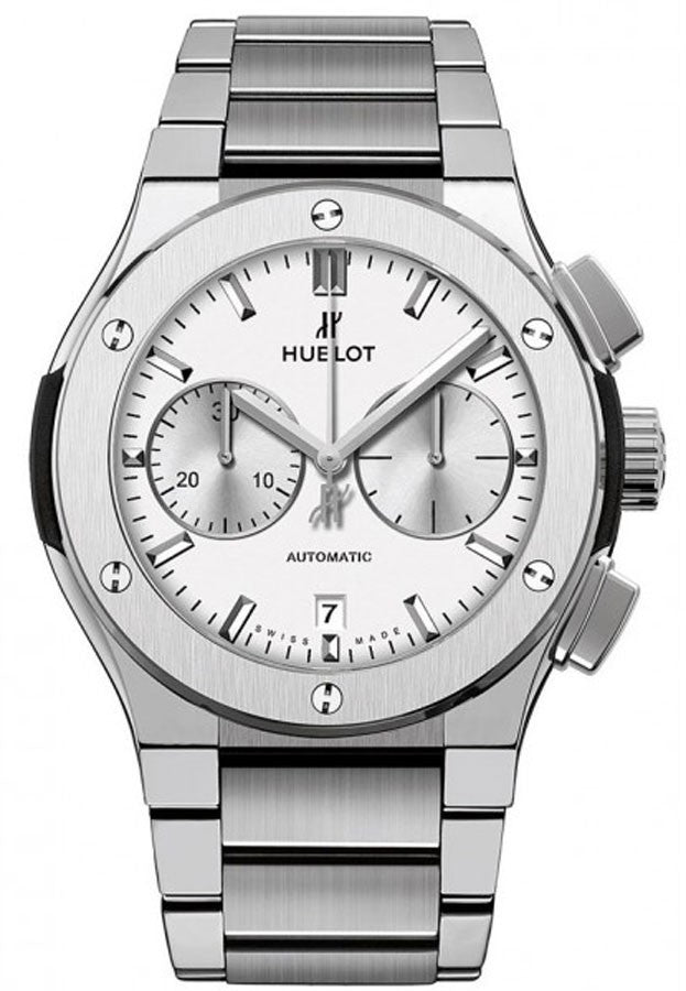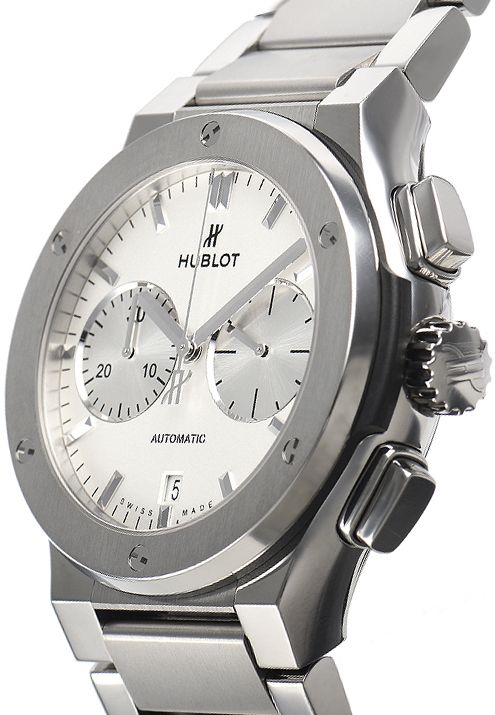 Also Known As Model # 520NX2610NX Hublot Classic Fusion Chronograph 45MM 520.NX.2610.NX. Comes with a polished titanium case with brushed top & bottom center links between the lugs. The titanium bezel has a brushed finish top, polished finish edge and is secured with 6 polished "H" style titanium screws. The main dial is white with silver sub-dials. Dial type: Analog. The date display appears at 6 o'clock position. The chronograph has 2 sub-dials displaying a 30 minute counter at 9 O'Clock and a small seconds counter at 3 O'Clock. Powered by the Hublot Caliber HUB1143 self-winding automatic movement which beats at 28,8800 vph, is composed of 280 parts, contains 59 jewels, and boasts a power reserve of 42 hours. Scratch resistant sapphire crystal. See-through mineral case back. Case diameter: 45 mm. Case shape: round. Includes a titanium bracelet and deployment buckle. Water-Resistant at 50 meters / 165 feet. Functions: chronograph, date, hour, minute, second. Luxury watch style. Watch label: Swiss Made.