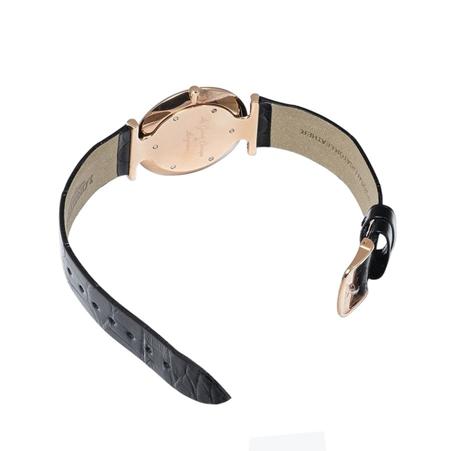 The La Grande Classique from Longines is a timepiece that features a 33mm rose gold tone case, white mother of pearl dial, and quartz movement. The diamond hour markers add a touch of luxury, while the black leather strap and tang buckle keep it classic. The rose gold details elevate the look of this sophisticated watch.