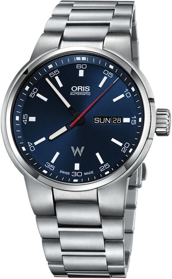 Oris Williams Day Date 01 735 7740 4155-07 8 24 50S men's watch. Features a brushed with polished stainless steel case with fixed bezel and stainless steel bracelet. The blue dial features Superluminova BG W9 luminescence in the hands and index hour markers. The date and day of the week are displayed in windows at 3 o'clock. The day and date are instantaneous and feature day and date correctors. Also features fine timing device and stop-second function. Powered by the Oris caliber 735, base SW 220-1 self-winding automatic movement which boasts a 38 hour power reserve, beats at 28,800 vph and contains 26 jewels. A flat scratch resistant sapphire crystal with anti-reflective coating on the inside protects the dial. The case back is screwed and features see-through mineral glass. The case is round and 42 mm in diameter. Stainless steel push and pull crown. Interhorn width: 24 mm. Stainless steel folding clasp. Water-Resistant to 100 meters / 330 feet. Functions: hours, minutes, seconds, instantaneous day and date, day and date correctors, stop-second. Sport watch style. Swiss Made.