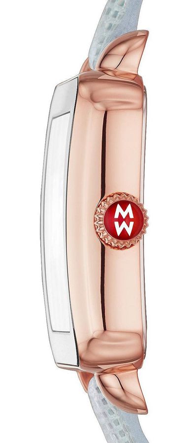 The Michele Deco Sport MWW06K000033 women's watch features a rose gold-tone stainless steel case and an iridescent grid-patterned French leather strap. The stainless steel fixed reflector bezel and scratch resistant sapphire crystal provide durability and protection. The mirror silver dial boasts aqua topaz index hour markers and luminescent hands, as well as a date window at 6 o'clock. With a round 34mm x 36mm case and 18mm inlet size, this watch is powered by a battery operated quartz movement and has a water resistance of 50 meters / 165 feet. A Swiss made movement ensures precise timekeeping for the hours, minutes, seconds, and date functions. aka 6K33