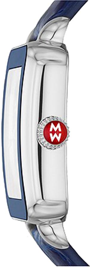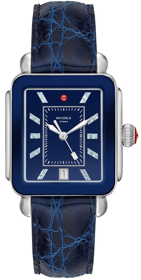 Presenting the Michele Deco Sport Topaz Women's Watch MWW06K000034. This timepiece, measuring 34mm x 36mm, boasts a durable stainless steel case with a stunning blue bezel. The blue leather strap adds a touch of elegance, with a unique pattern design. The mirror dial, in a striking shade of blue, features luminous hands and topaz index hour markers. Plus, the convenient date window at 6 o'clock adds practicality. All this is powered by a reliable battery-operated quartz movement. aka 6K34
