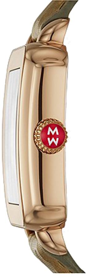 This Michele Deco Sport MWW06K000041 women's watch has a 34mm x 36mm beige gold tone case and a beige dial. It is accompanied by an olive embossed french leather strap, and boasts a beige dial with index hour markers and a 6 o'clock date window. The watch is powered by a battery-operated quartz movement. aka 6K41