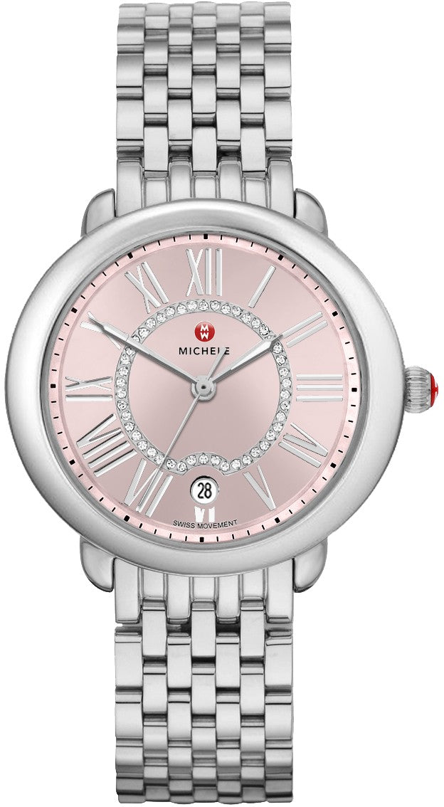Experience true luxury with the Michele Serein Mid watch. Featuring a Swiss-made quartz movement and a stunning pink dial, this watch exudes elegance and sophistication. With its stainless steel bracelet and water resistance up to 50 meters, it is the perfect blend of style and function. Treat yourself to the ultimate timepiece. aka 21B115