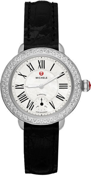 Presenting the Michele Serein 12 MWW21E000002, a luxurious timepiece designed with sophisticated elegance. Featuring a sleek design with a stainless steel case and black leather strap, this watch is perfect for any occasion. With its Swiss quartz movement and water resistance up to 50 meters, the Michele Serein 12 offers precision and durability. Elevate your style with this stunning watch. aka 21E2