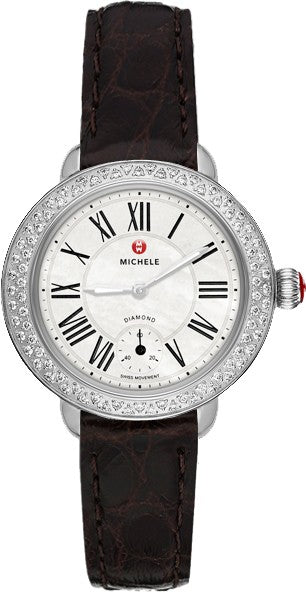 This Michele Serein 12 watch, model MWW21E000005, features a stainless steel case and espresso leather strap, a mother-of-pearl dial, and roman numeral hour markers. This luxurious watch is perfect for any occasion. Elevate your style and make a statement with the Michele Serein 12 MWW21E000005. aka 21E5