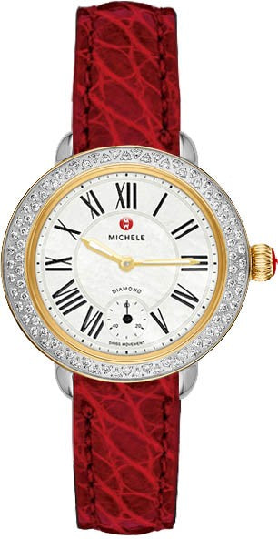 The Michele Serein 12 MWW21E000010 boasts a stunning diamond-encrusted bezel and garnet leather strap. This elegant timepiece elevates any outfit and is a testament to exceptional craftsmanship. With a classic yet modern design, it is the perfect accessory for any occasion. aka 21E10