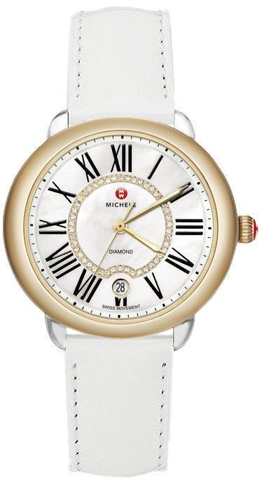 Expertly crafted with precision and elegance, the Michele Serein 16 MWW21B000016 watch is a timepiece of unrivaled sophistication. Boasting a Swiss quartz movement, a yellow gold plated bezel, and a white patent leather strap, this watch offers the accuracy, luxury, and durability that only a true expert can deliver. aka 21B16