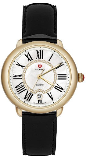 Presenting the Michele Serein 16 watch, featuring a polished yellow gold plated case and black patent leather strap with a mother-of-pearl dial. This elegant timepiece combines style and functionality, perfect for any occasion. Enhance your professional look with confidence and sophistication. aka 21B19