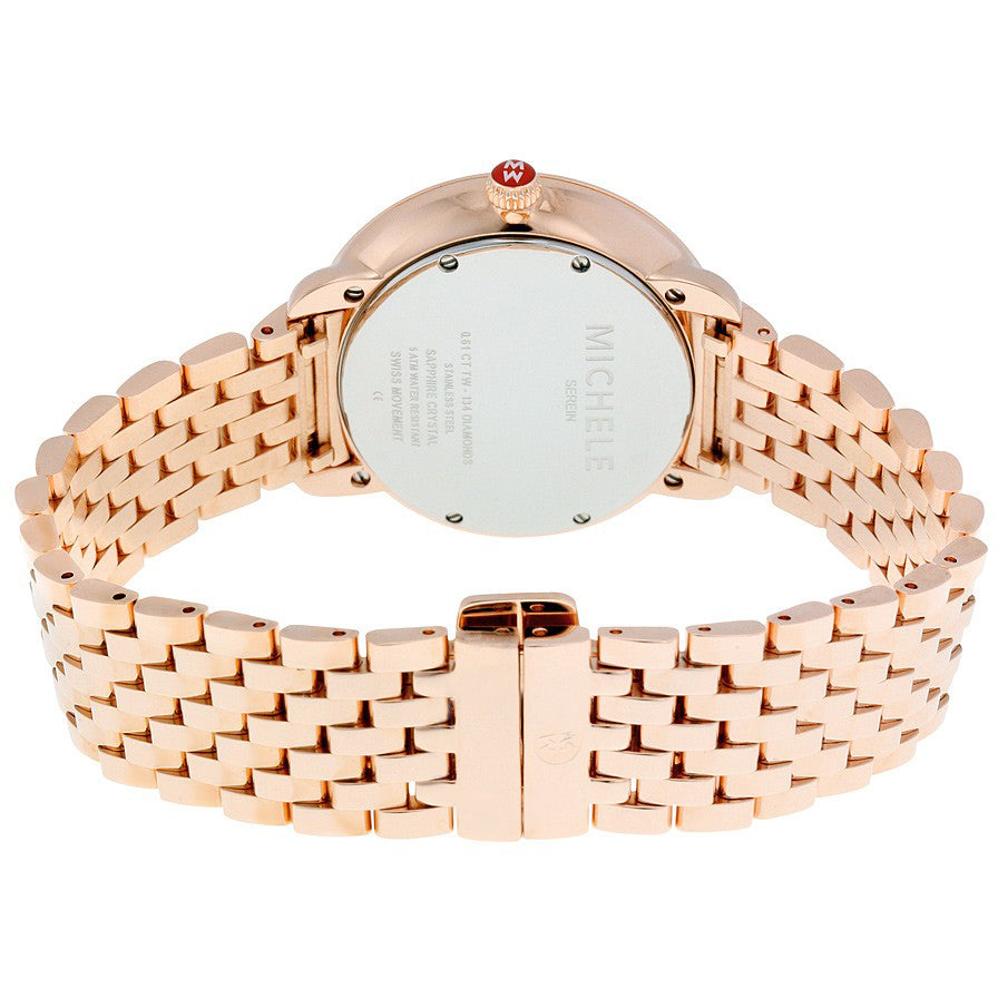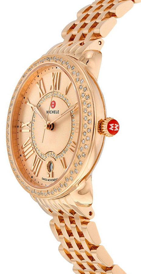 This Michele Serein 16 Diamond MWW21B000078 women's watch boasts a polished 18k Rose Gold Plated Case and bracelet, a rose gold fixed bezel set with diamonds, and a sunray beige dial adorned with diamonds. A total of 134 diamonds with a weight of 0.61 Carat add a touch of elegance to this timepiece. Featuring Roman numeral hour markers and second/minute markers, this watch is powered by a battery operated quartz movement and protected by a scratch resistant sapphire crystal. The 36mm x 34mm round case is 8.5mm thick and has an inlet size of 16mm. The solid case back, push and pull crown, and deployment buckle add to its functionality and style. With a water resistance of 50 meters / 165 feet, this watch also functions as a date display. Sophisticated and Swiss made, this fashion watch is a must-have for any collection. aka 21B78