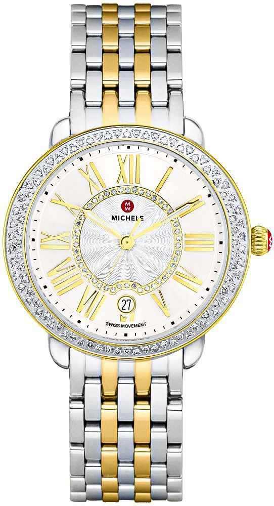 Michele Serein Mid Two-Tone Diamond MWW21B000138 women's watch. Features a polished stainless steel case and polished stainless steel with yellow gold-tone stainless steel bracelet. Yellow gold-tone stainless steel fixed bezel set with diamonds. Sunray silver dial set with diamonds. 134 total diamonds with total diamond weight of 0.61 Carat. Date window displayed at 6 o'clock. Powered by a battery operated quartz movement. A scratch resistant sapphire crystal protects the dial. The case is round and 36mm x 34mm in diameter. Inlet size: 16mm. Push and pull crown. Stainless steel deployment buckle. Water resistant to 50 meters / 165 feet. Functions: hours, minutes, seconds, date. Casual watch style. Swiss made. aka 21B138