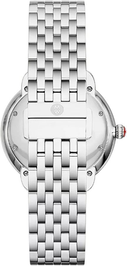Designed for women, the Michele Serein Mid Silver Dial Watch (model MWW21B000147) showcases a sleek 36mm x 34mm polished stainless steel case and bracelet. The silver dial adorns 46 sparkling diamonds, accentuated by Roman numeral hour markers, and is powered by a reliable battery-operated quartz movement. aka 21B147