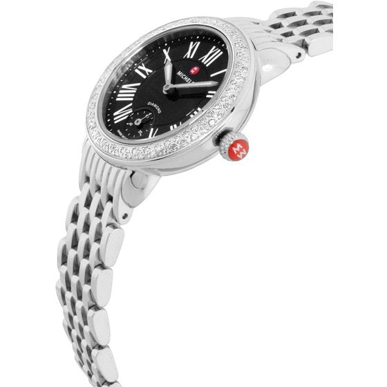 The Michele Serein 12 Black Dial Stainless & Diamond Ladies Watch MWW21E000018 boasts a polished stainless steel case and bracelet, along with a fixed bezel set with 84 diamonds (0.36ct). The Black Mother of Pearl dial showcases Roman numeral hour markers and luminescent hands, while the small seconds sub-dial is positioned at 6 o'clock. This watch runs on a battery operated quartz movement and features a scratch-resistant sapphire crystal. With a round case measuring 28mm x 27mm in diameter and an inlet size of 12mm, this timepiece is completed with a push and pull crown, stainless steel deployment buckle, and water resistance up to 50 meters / 165 feet. Its functions include hours, minutes, and small seconds, making it a perfect choice for fashion-forward individuals. This watch is proudly Swiss made and showcases expert craftsmanship. aka 21E18