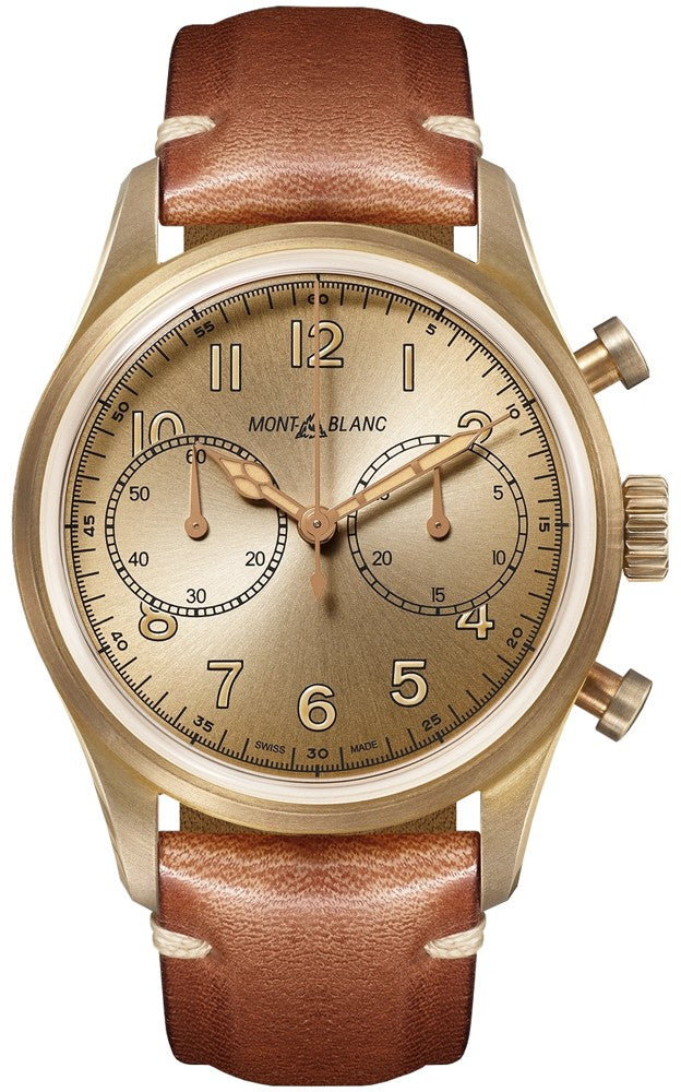 MontBlanc 1858 Automatic Chronograph 118223 men's watch. Features a brushed with polished bronze case and brown leather strap. Brushed bronze fixed bezel. Chronograph with large central chronograph seconds hand and 30 minute counter sub-dial at 3 o'clock. Small seconds sub-dial at 9 o'clock. Powered by the MontBlanc Caliber MB 25.11 self-winding automatic movement which boasts a 48 hour power reserve, beats at 28,800 vph and contains 27 jewels. A scratch resistant sapphire crystal protects the dial. The case is round, 42mm in diameter, weighs 111g and is 14.55mm thick. Inlet size: 22mm. Bronze-coated titanium case back with compass and MontBlanc mountain engraving. Push and pull crown. Deployment buckle. Water resistant to 100 meters / 330 feet. Functions: hours, minutes, small seconds, chronograph. Casual watch style. Swiss made.